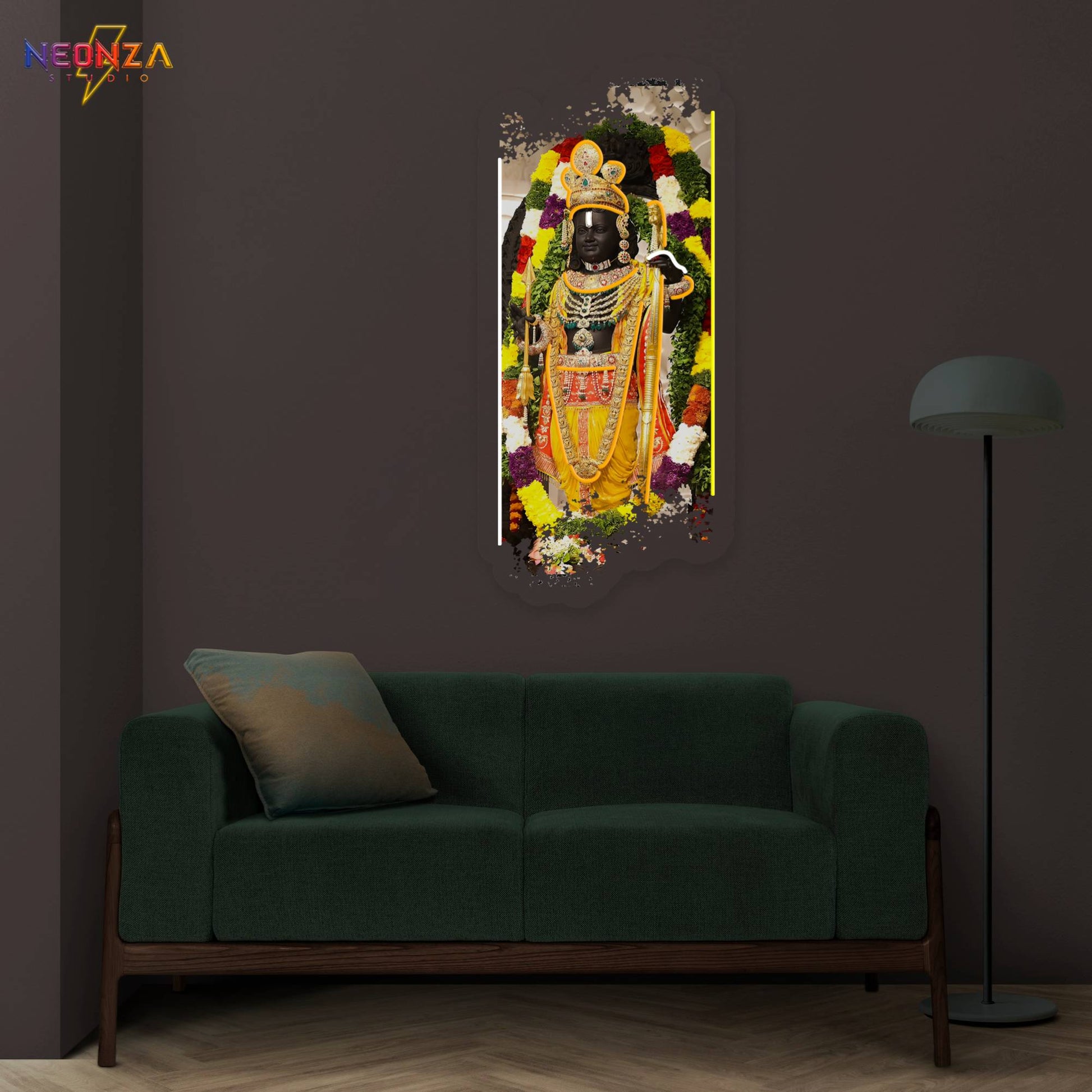 "Elevate your home decor and add a touch of spirituality with the magnificent Ram Lalla Neon Sign Artwork. Perfect for your mandir temple or any room, this exclusive piece of art exudes elegance and sophistication. Let the soft neon glow of Ram Lalla's presence enhance your space.