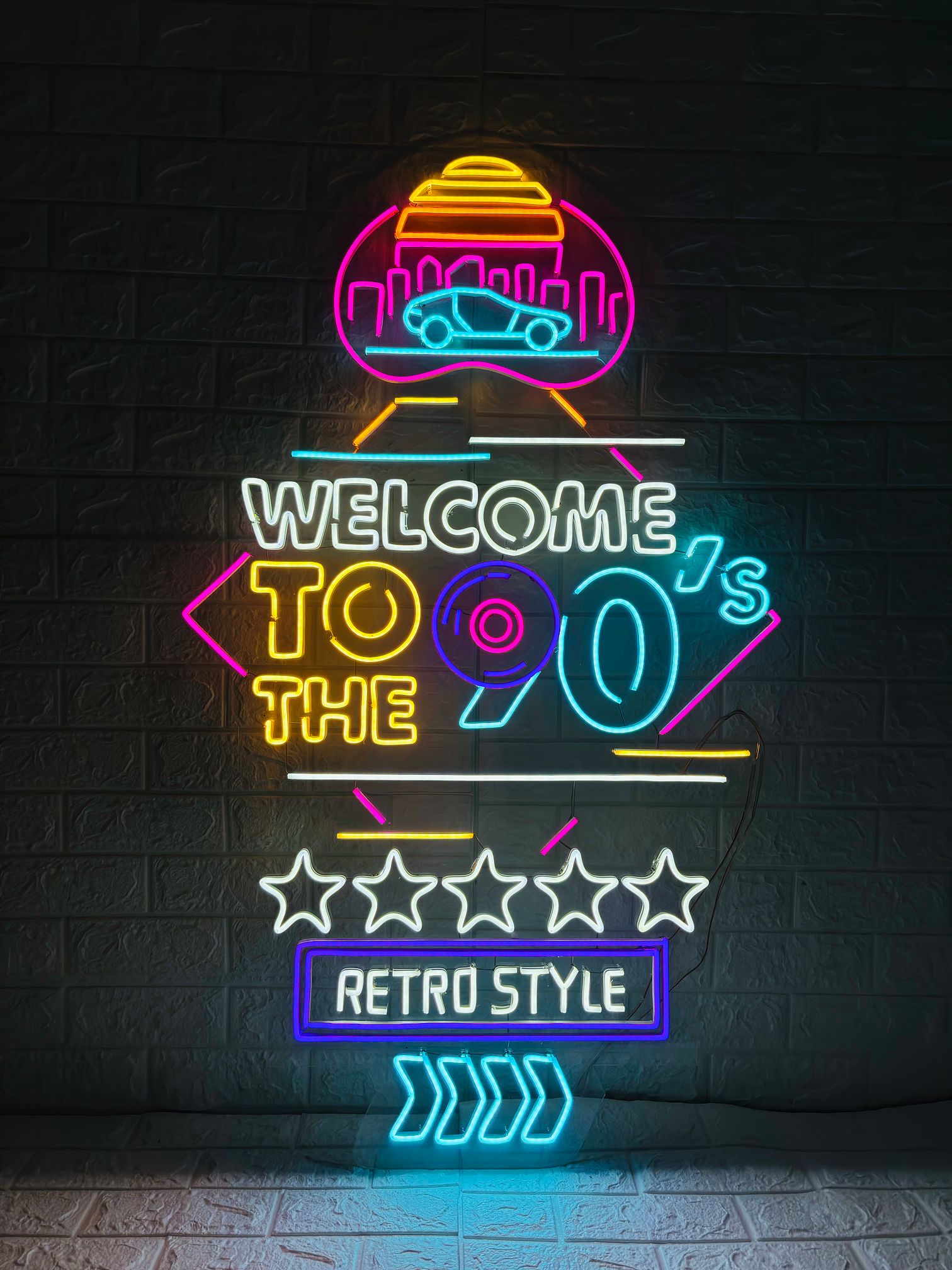Step into the past with our Welcome to the 90's Retro Neon Sign. Transform any space into a nostalgic haven with this vibrant, eye-catching sign. Embrace the essence of the 90's with a touch of luxury. Illuminate your surroundings with a piece of art that embodies the spirit of the decade.